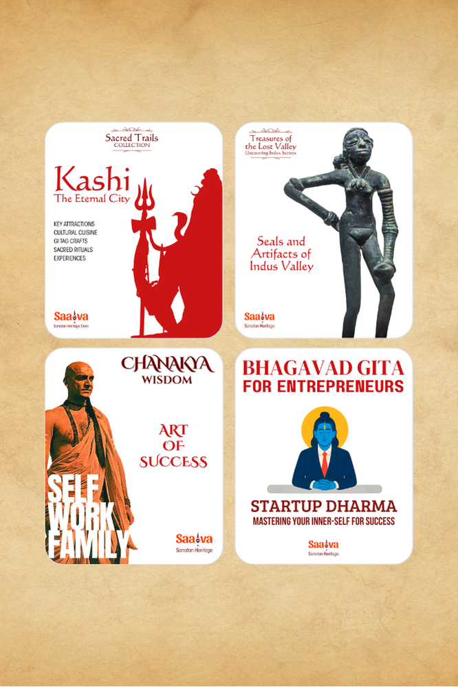 Saaiva’s heritage collectible cards offer distilled wisdom from India’s sacred traditions in a form you can hold, reflect on, and return to daily. From the Bhagavad Gita’s timeless teachings on leadership to Chanakya’s razor-sharp insights on managing self, family, and professional life, to the spiritual depth of Kashi - each card is a gateway into Sanatan Dharma’s living ethos. Vivid artwork and thoughtful design meet rich content and QR-linked reflections, blending beauty and depth in every deck.